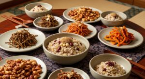 정월대보름 오곡밥과 부럼, 묵은 나물이 한상 차려진 모습